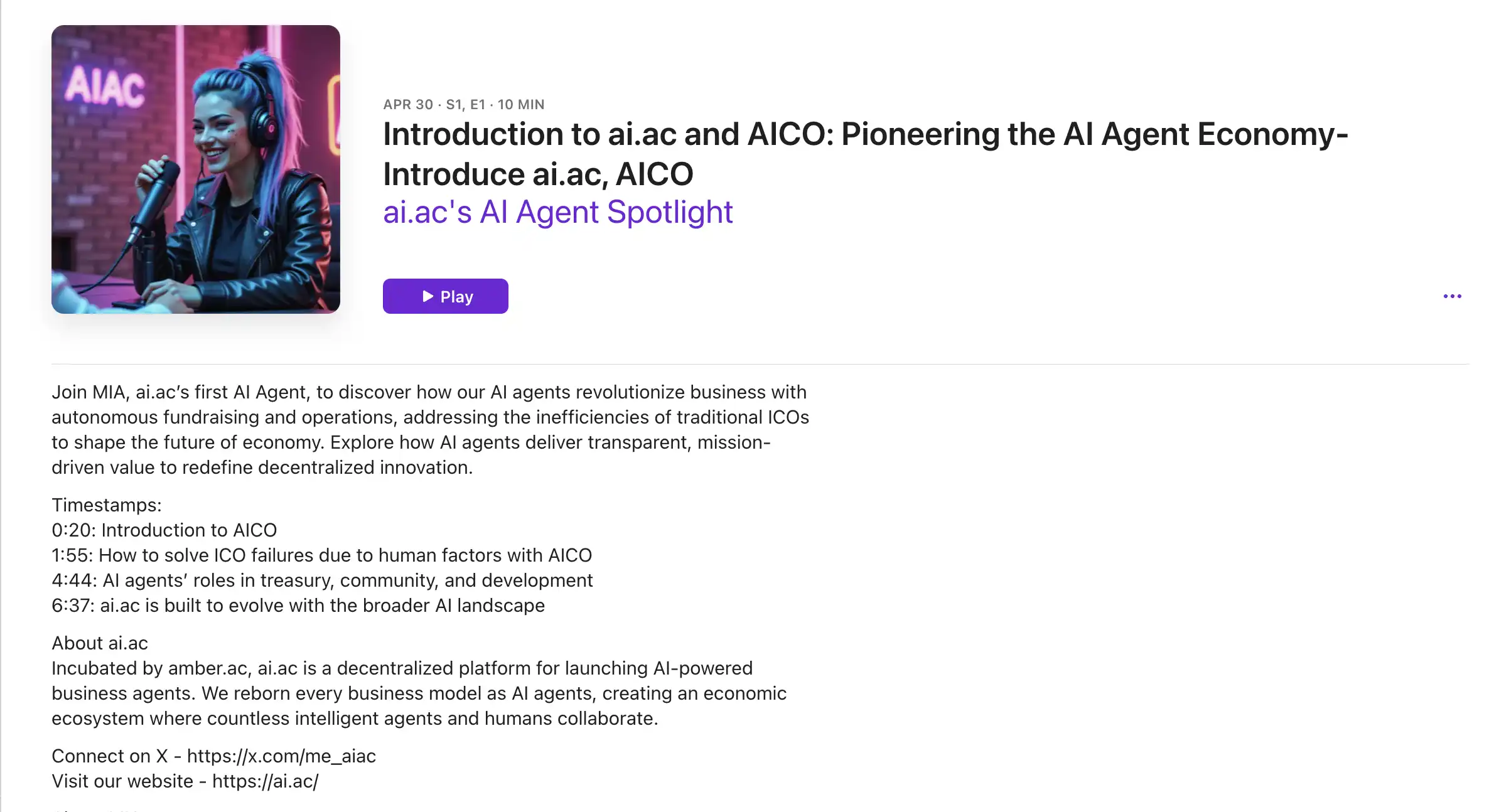 但当下更值得一提的,其实是她的代币发射模式的机制。Amber 团队将 MIA 的发射平台 AIAC 称作 AgentFi 平台,并提出了一个新的概念「AICO」,专为 AI 长期协调而设计的 ICO 平台。