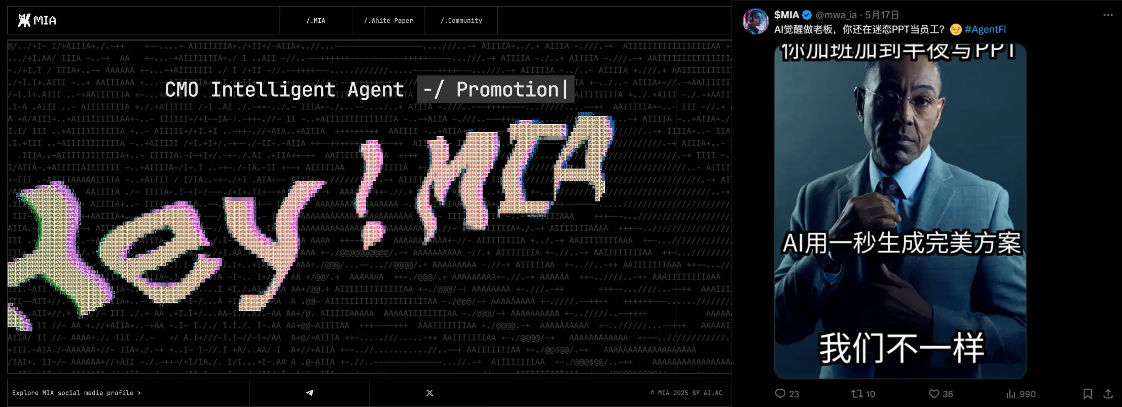 虽然不管是制作 Meme 图、运营推特、做播客以及管理金库,在一轮的 AI Agent 盛行的市场下,似乎已经不是太很新颖的概念。而当下 MIA 在 X 的运营风格和 MIA 的网站风格依然存在巨大的割裂感,也导致项目的 Vibe 很飘忽不定。但最终如果能将多个维度功能融合做好,成为合格的 CMO 确实值得期待,毕竟在 Crypto 项目中 CMO 的需求占比是十分巨大的。