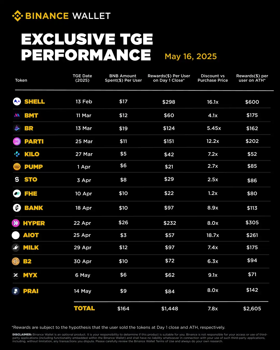 · Binance 钱包专属 TGE:众多项目选择在 Binance Alpha 上独家举办 TGE,原因在于该平台提供的强大流动性与用户参与度。2025 年以来,Alpha 平台共推出 15 场 TGE,参与用户以远低于市场价的折扣购入代币,平均购入价仅为上线首日收盘价的 1/8。
