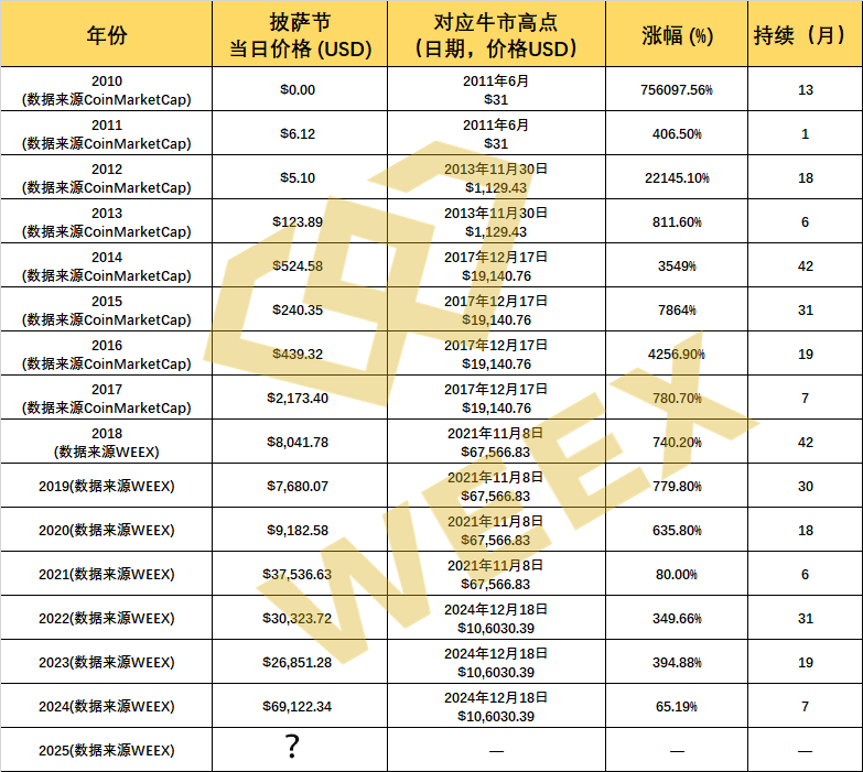 数据来源: 比特币历史价格数据来自 CoinMarketCap 和 WEEX 唯客交易所历史快照和其他资料。上述涨幅和持续时间为按上述数据计算所得。