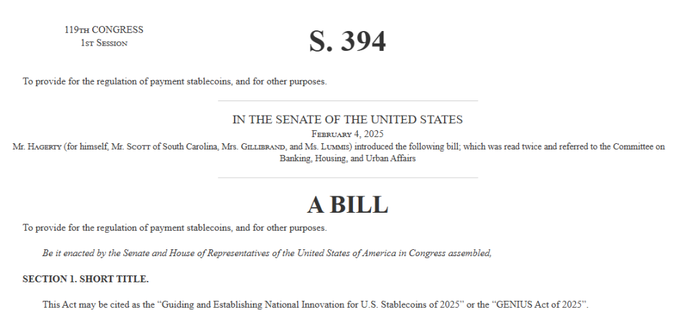 虽然简写为 GENIUS Act, 直译为天才法案,但它实际上是 Guiding and Establishing National Innovation for U.S. Stablecoins,实际翻译为「引导和建立美元稳定币的国家创新」。