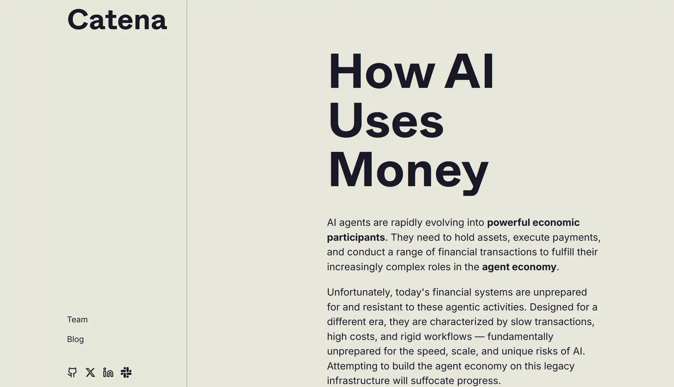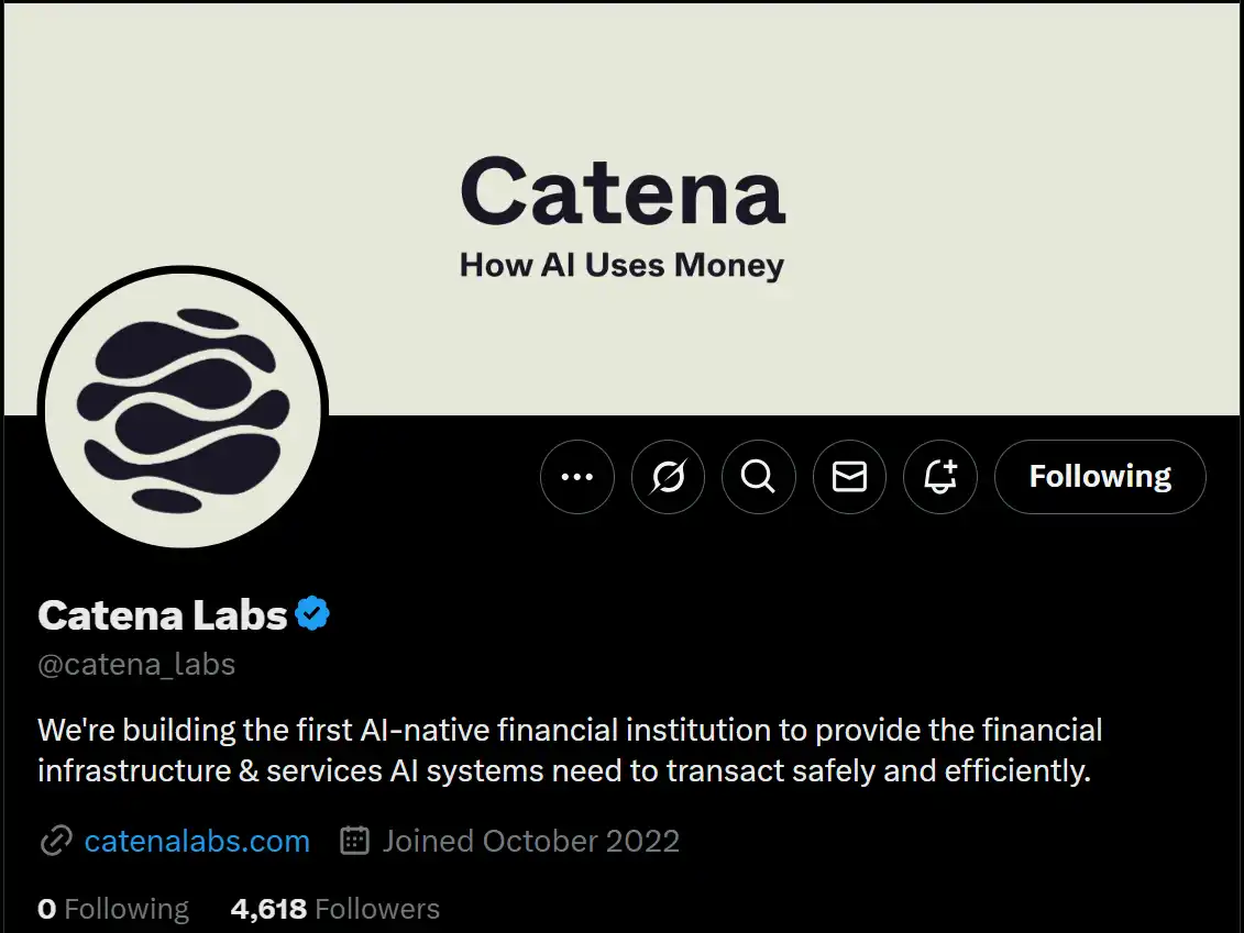 Catena Labs 由 Circle 联合创始人 Sean Neville 创立,最初于 2021 年以探索 AI 与去中心化身份为方向成立,2023 年正式聚焦于构建「AI 原生金融系统」。