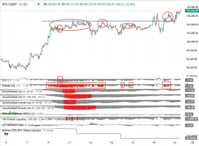 最近一次出现红色则是在 106000 区间。可以看到,明明价格升高了,但 LIQ 的红色提示却大幅减少,这是什么原因?这是我所说的「以涨代跌」的行情,也是多头强势的关键证据。