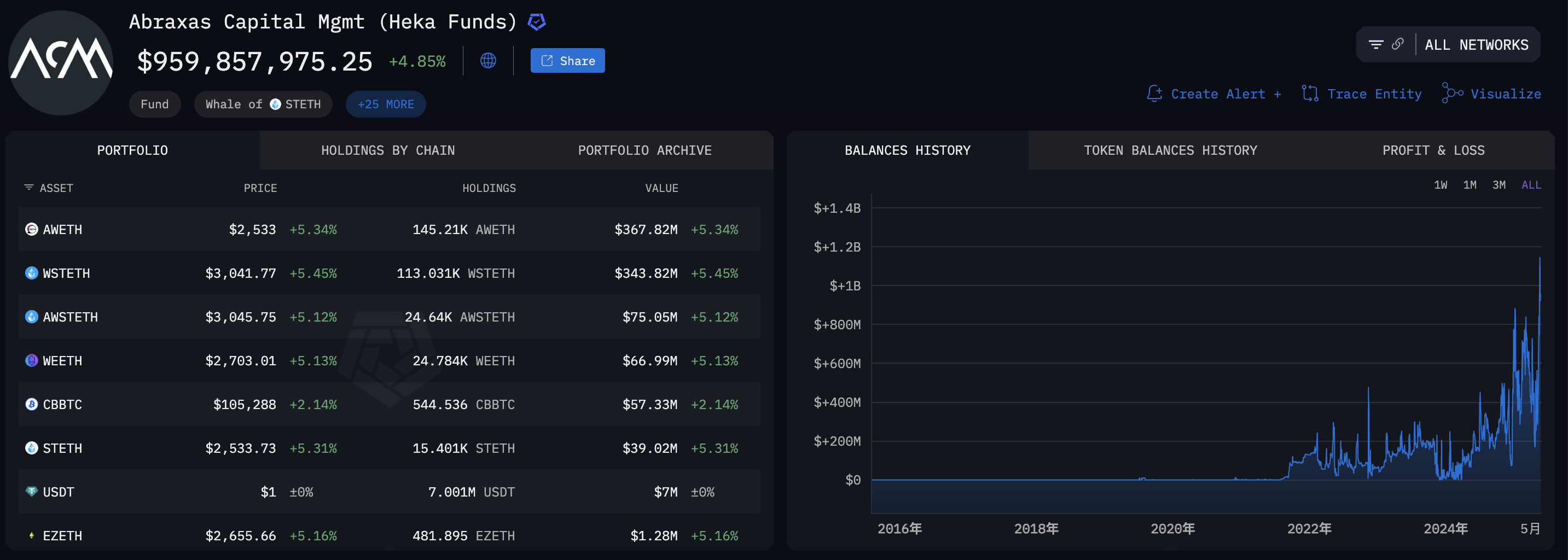 根据 Arkham 数据显示,截至 5 月 20 日,Abraxas Capital 两个相关公开地址所持有的加密资产总价值已超过 11.5 亿美元,累计盈利约 2.8 亿美元。