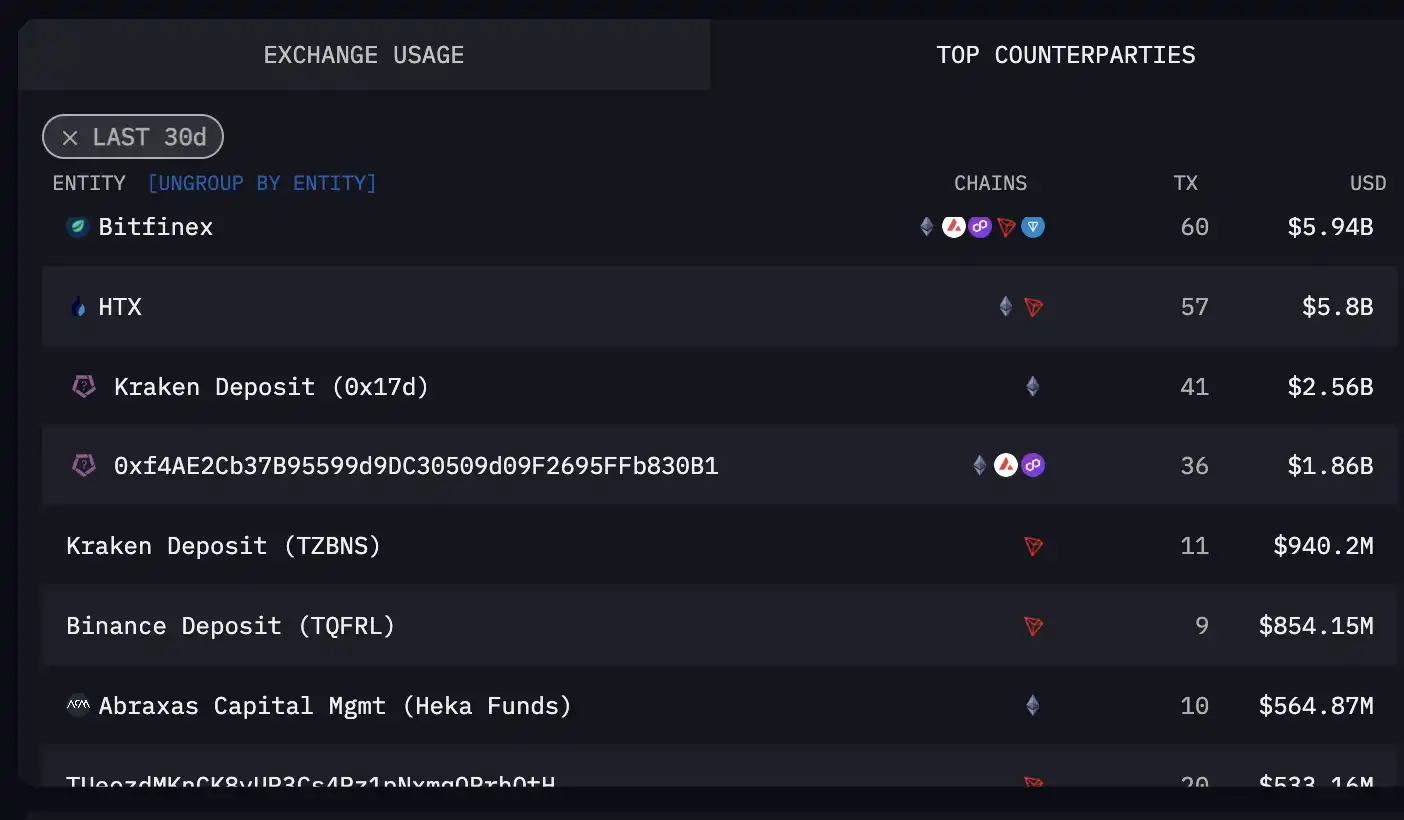 凭借持续的交易与合作,Heka Funds 逐渐成长为 Tether 最大的机构客户之一,可以说 Heka Funds 也是 Tether 的快速发展的推手。根据 Protos 于 2021 年发布的研究报告,Heka Funds 彼时获得了超过 15 亿美元的 USDT,占 Tether 总发行量的约 1.5%。这一年,Heka Funds 累计获得约 5200 万美元利润,远超母公司 Abraxas 所取得的 580 万美元利润,成为集团内部最成功的基金之一。而在过去 30 天,Arkham 数据显示,过去 30 天,Tether 主要交易对手中,Heka Funds 的交易金额达 5.64 亿美元,排名第八。