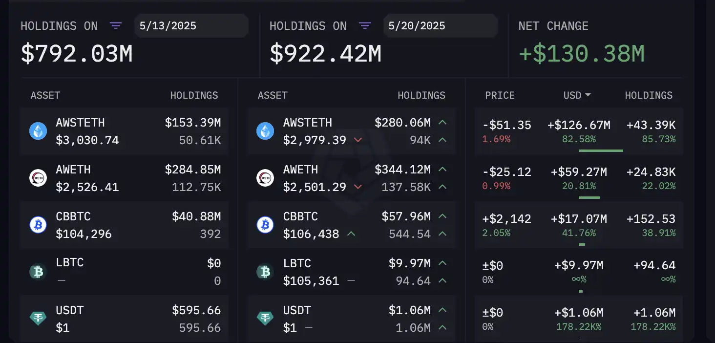 从资金增长节奏来看,自 2025 年 2 月中旬以来,该机构的资产规模显著提速,并在近期一度突破 10 亿美元大关。仅在过去一周(5 月 13 日至 20 日),其净资产增长便超过 1.3 亿美元,增幅主要来自 AwSTETH(Aave v3 wstETH)仓位的大幅加码,增持金额超过 1.2 亿美元。