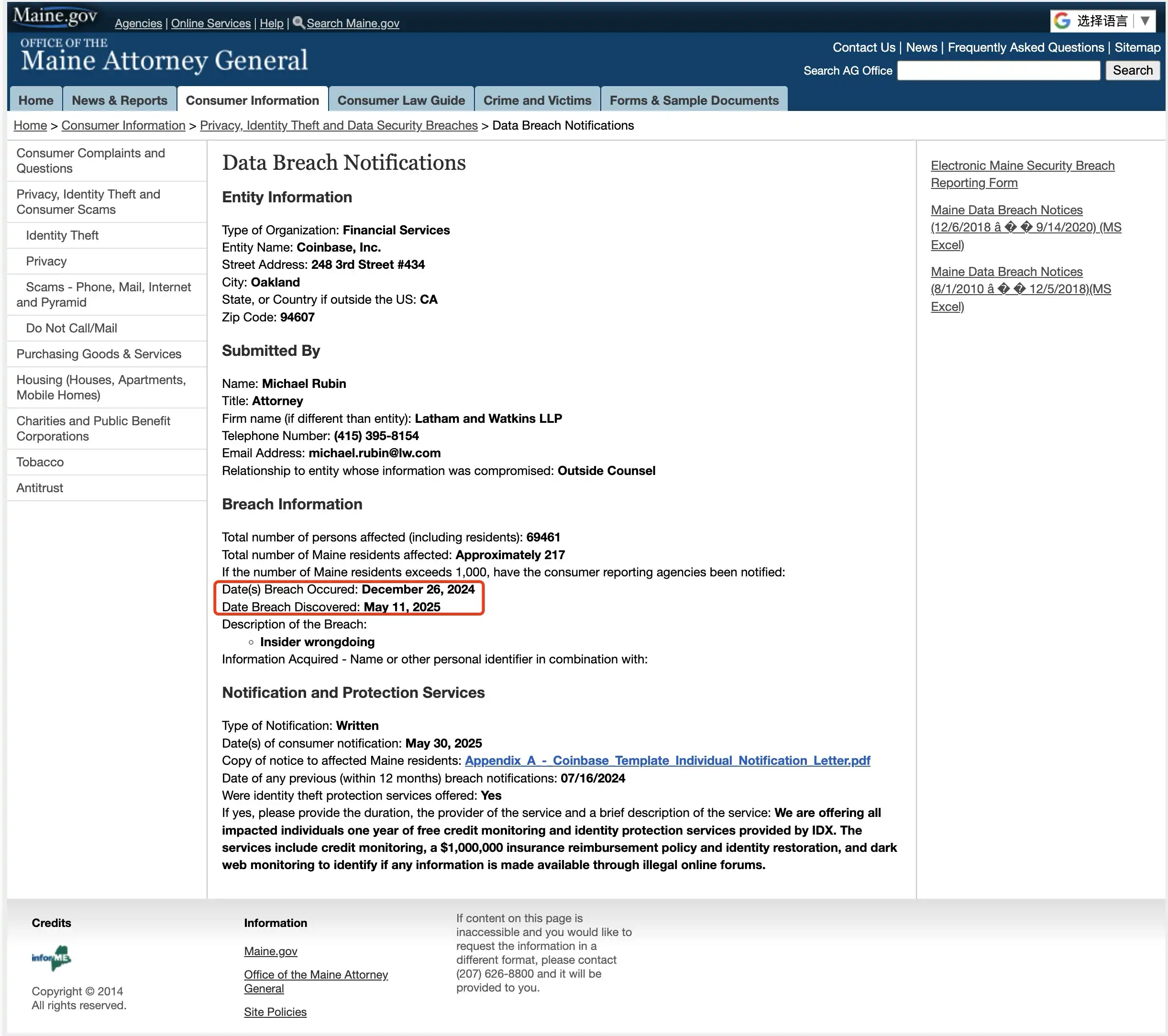 再看 5 月 20 日 Coinbase 向缅因州总检察长办公室提交的报告,数据泄露事件发生的时间更早,是在 2024 年 12 月 26 日。