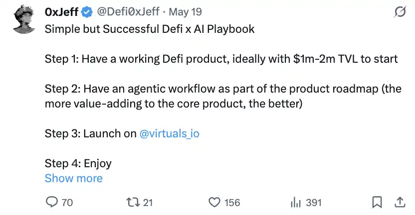 选择是自行发行代币还是通过发射台发行,可能会决定项目的成败。人工智能相关项目近一年来一直是市场关注度最高的类别,因此调整你的产品以满足「人工智能」要求,并在排名第一的人工智能发射台 @virtuals_io 上发行是一个明智的选择。