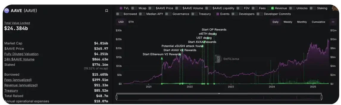 Aave 的 TVL(数据来源:https://defillama.com/protocol/aave?tokenLiquidity=false&borrowed=false&revenue=true)