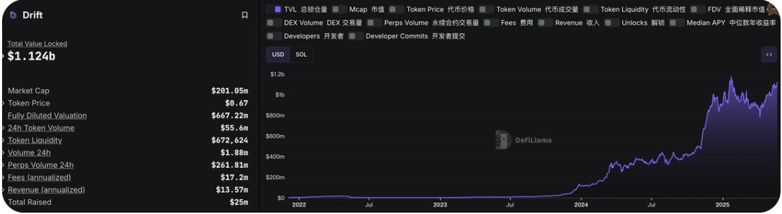 Drift 的 TVL(数据来源:https://defillama.com/protocol/drift?dexVolume=false&perpsVolume=false&tokenVolume=false)