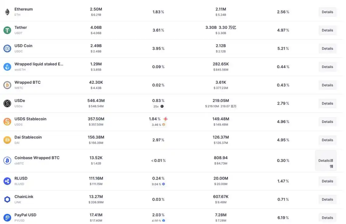 Aave 的各个借贷池情况(数据来源:https://app.aave.com/markets/)
