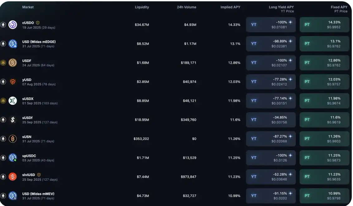 Pendle 的部分稳定币 TVL 示意图(数据来源:https://app.pendle.finance/trade/markets)