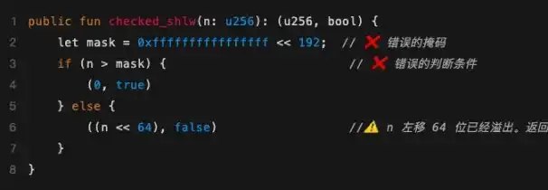 · 真正的问题:当 n >= 2^192 时,n << 64 会超出 u256 范围并被截断