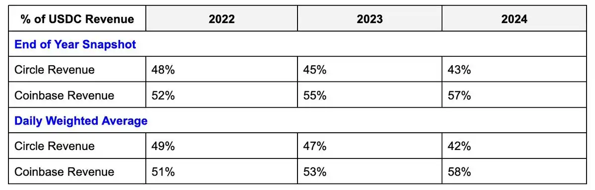 但这里有个关键点:Circle 从平台外的 USDC 中获得了不成比例的收益。尽管 Coinbase 平台上的 USDC 数量是 Circle 的 4 倍,但它在收入上的优势仅约为 1.3 倍。