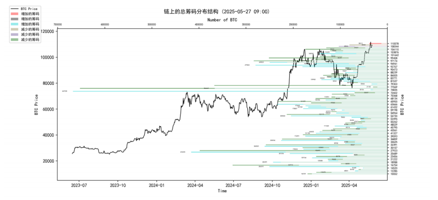 当前存量顶部价格在 108000 左右,短期成本线的价格在 95000 左右。可能⽬前的定价会在这两个价位附近徘徊。