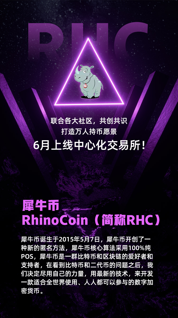 犀牛币,英文名RhinoCoin(简称RHC),犀牛币诞生于2016年7月,犀牛币开创了一种新的匿名方法,犀牛币核心算法采用100%纯POS,总量为1000万亿。犀牛币的创始人是一群比特币和二代币的爱好者和支持者,在看到比特币和二代币的问题之后,我们决定尽自己的力量,用最新的技术,来开发一款适合全世界人使用、人人都可以参与的数字加密货币。