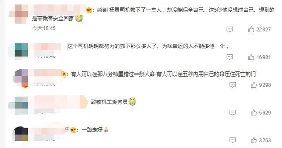 网友们纷纷留言致敬司机杨勇。有位网友的留言令人泪目:“这个司机明明都努力地救下那么多人了,为啥幸运的人不能多他一个。”