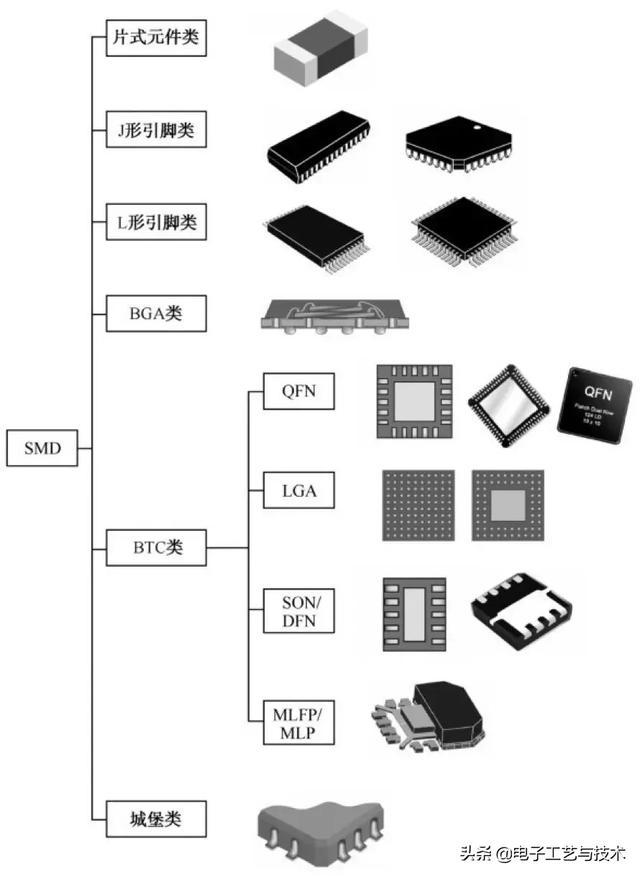 一、SMD的封装结构是工艺设计的基础,因此,在这里我们不按封装的名称而是按引脚或焊端的结构形式来进行分类。按照这样的分法,SMD的封装主要有片式元件(Chip)类、J形引脚类、L形引脚类、BGA类、BTC类、城堡类,如图所示。